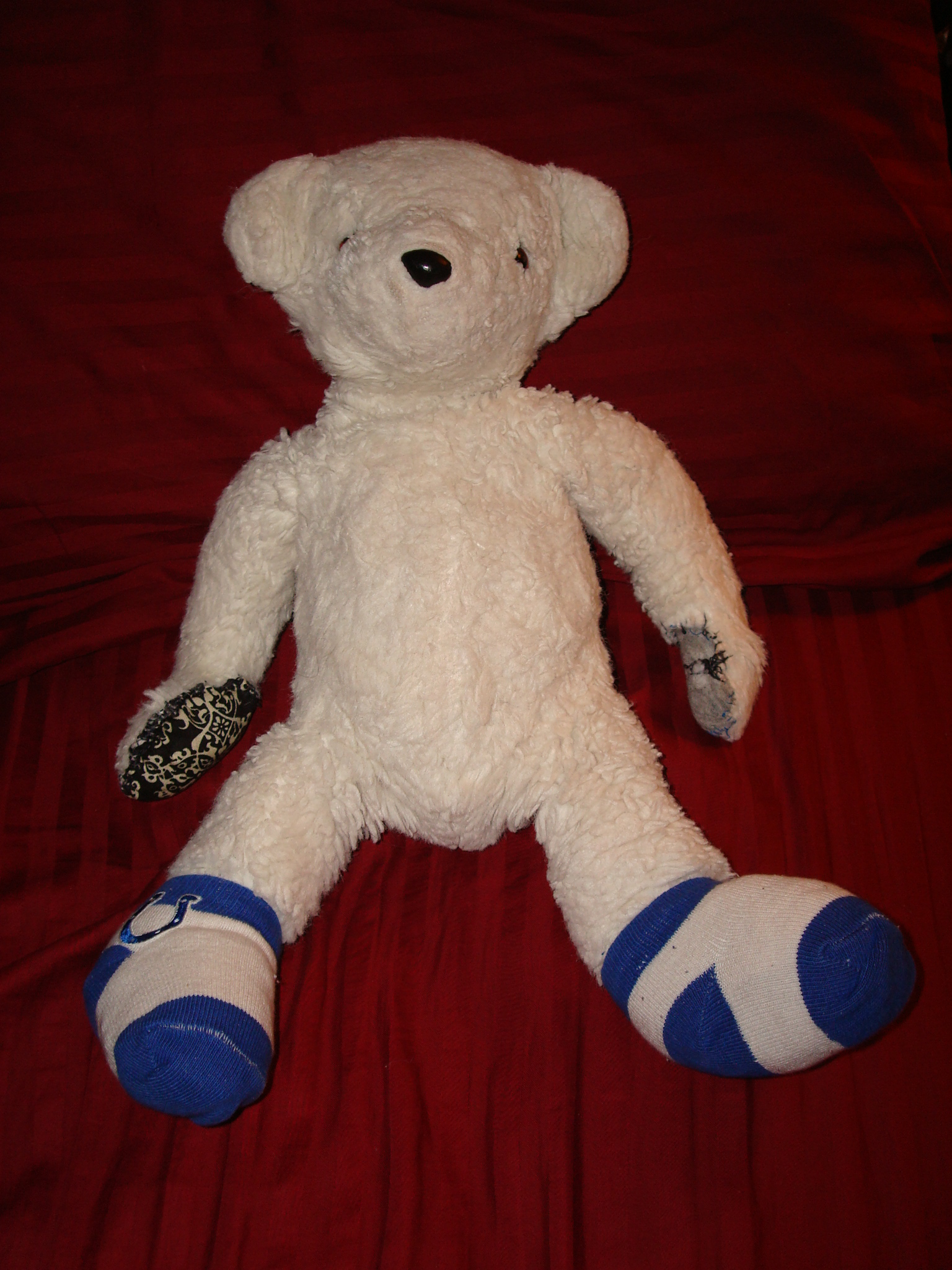Notice the Colts socks Mr. Bear wears. We are both Colt supporters and avid Peyton Manning fans. And Mr. Bear is still sleeping in our bed. The husband swears the itching is getting worse. He is such a CEO (Chief Exaggerating Officer).