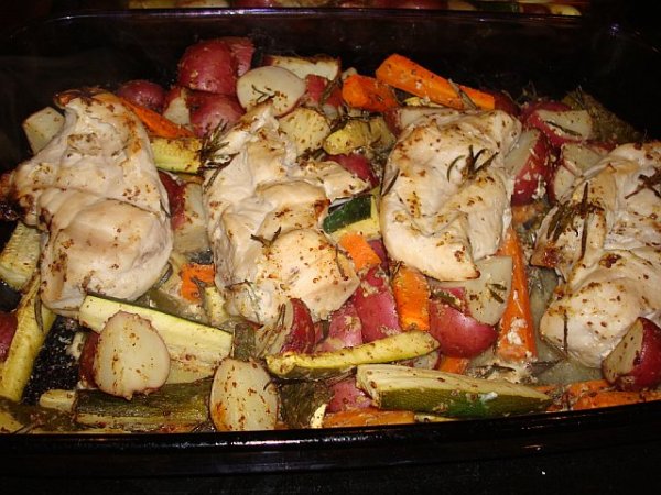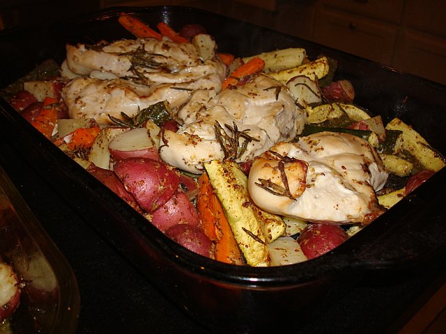 Place everything in a 9X13 baking dish. Roast for 25 minutes. Toss the vegetables, turn the chicken and continue roasting until chicken is cooked through, 20-25 minutes more.