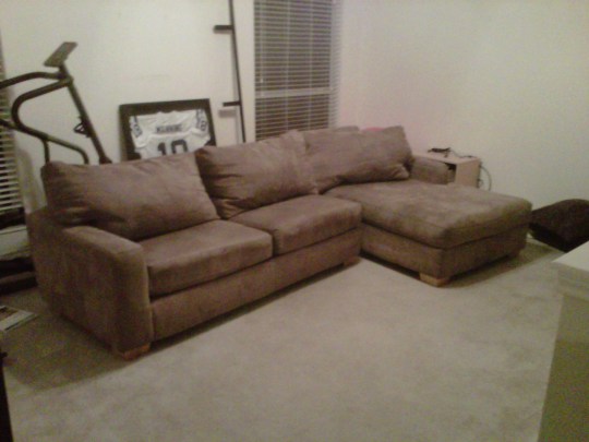 A microfiber couch with a chase lounge. 2 years old. From a pet-free and smoke-free home. They were asking $450 but agreed to our price of $350! SCORE! Sorry for the blurry cell phone picture.
