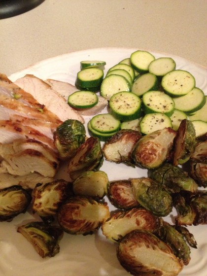 Once we got home from Dallas and unpacked everything we both were more than ready for some dinner. I was not in the mood to come up anything that took more than even an ounce of effort and we really didn’t have much to work with thanks to our travel plans this weekend. So I was forced to scrounge around and come up with this: chicken, roasted brussels sprouts and zucchini. It hit the spot!