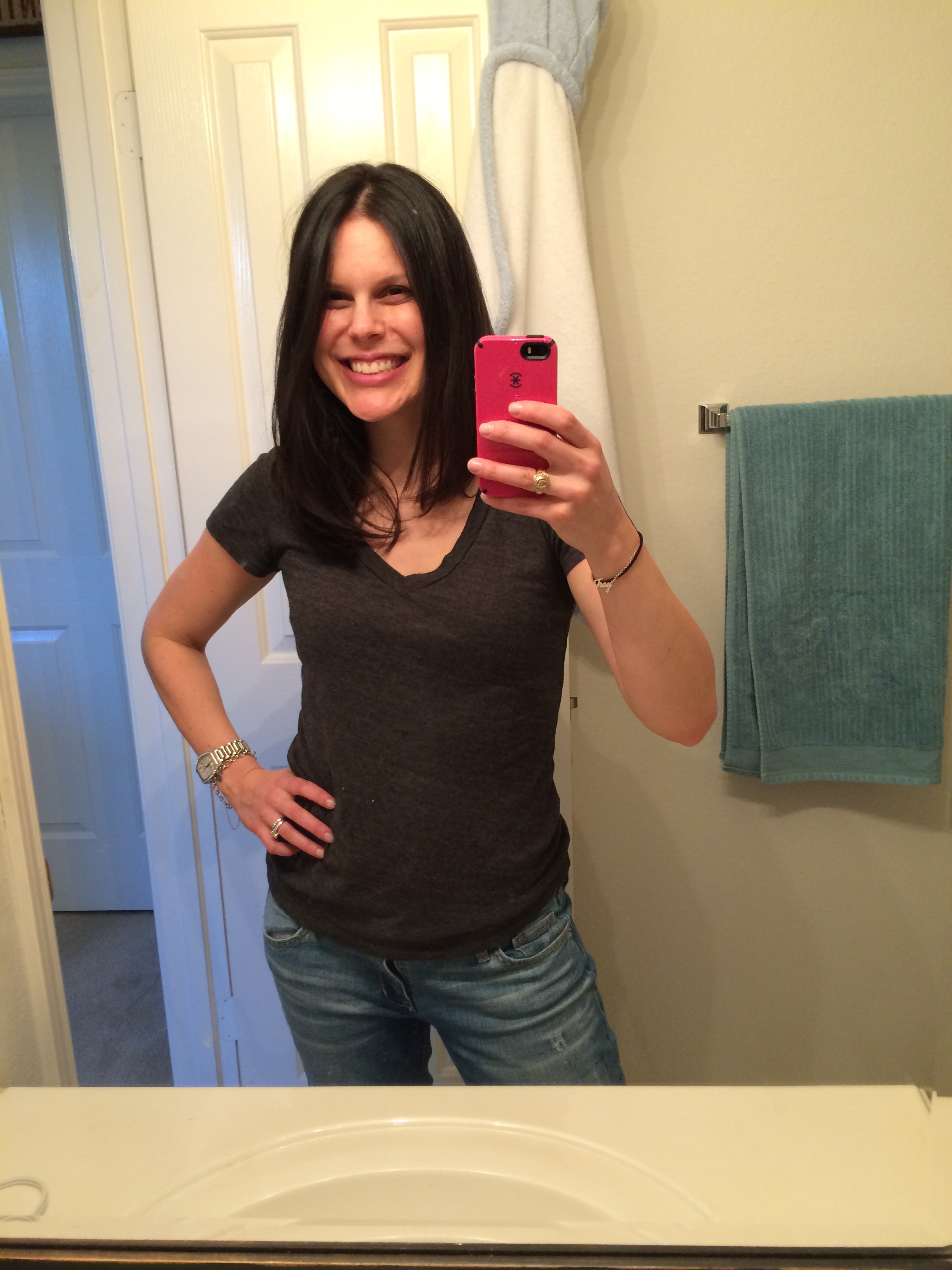 First up, I got my hair cut! I have been in a cutting mode lately. Since Trey was born I have cut 9 inches off! I got 5 inches cut off the day I went into labor (good timing!) and then I cut another 4 inches last week. I like my hair long but it is just too hot in the Texas summer for long hair AND Trey is quite the hair puller. I also got it colored. I finally caved. Standing in front of the mirror each night plucking out my gray hairs with eyebrow tweezers was just getting old. Ha! When did I get old enough to have gray hair?! 😦 But I asked my hair lady to match my color the best she could because I am a low maintenance hair girl and the idea of a major upkeep job was just not for me.