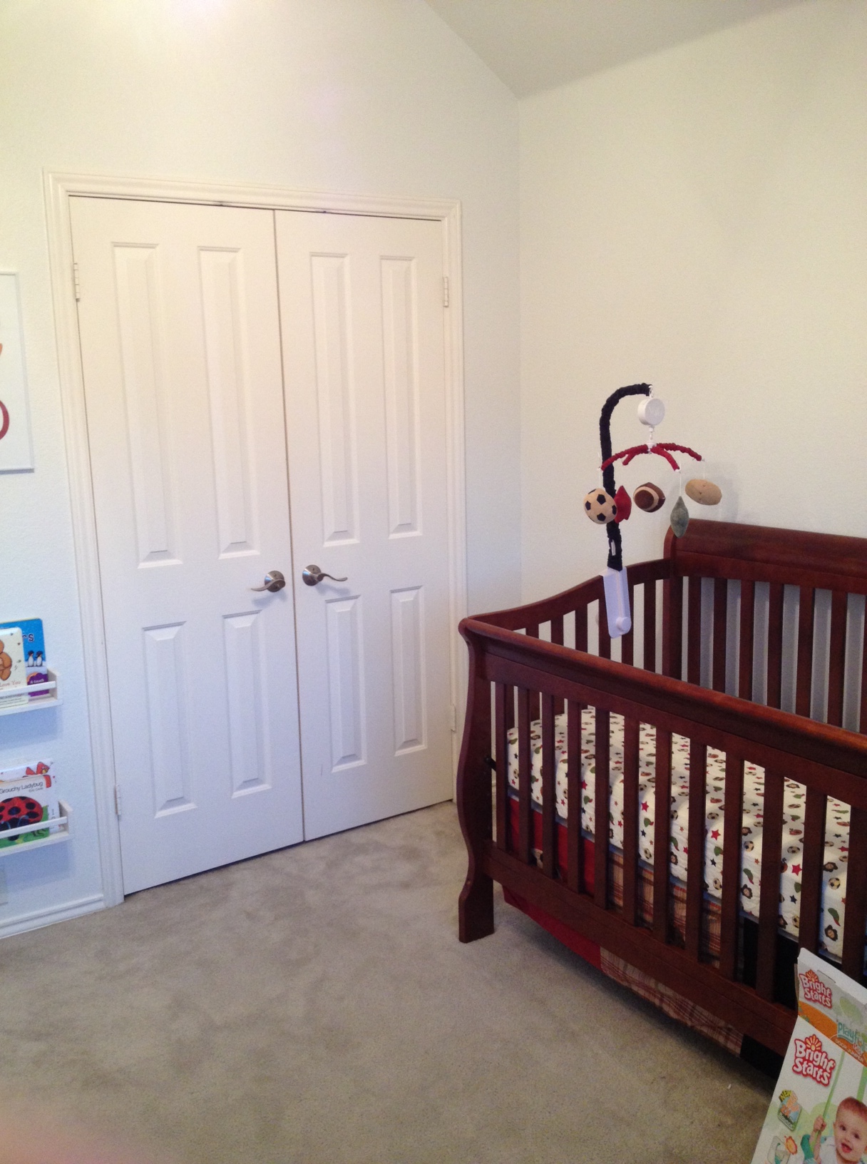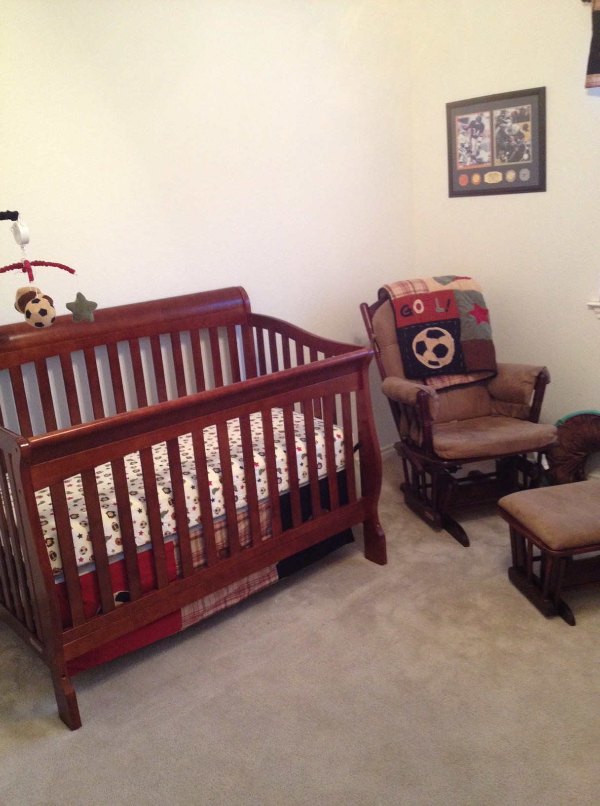So onto a more exciting thing….nursery pictures! The nursery is finally 100% complete and I am thrilled with how it all turned out! Here are some pictures. I took these with my phone and they are a little yellow. So sorry for the quality. 😦 I did a sports theme….shocking right?