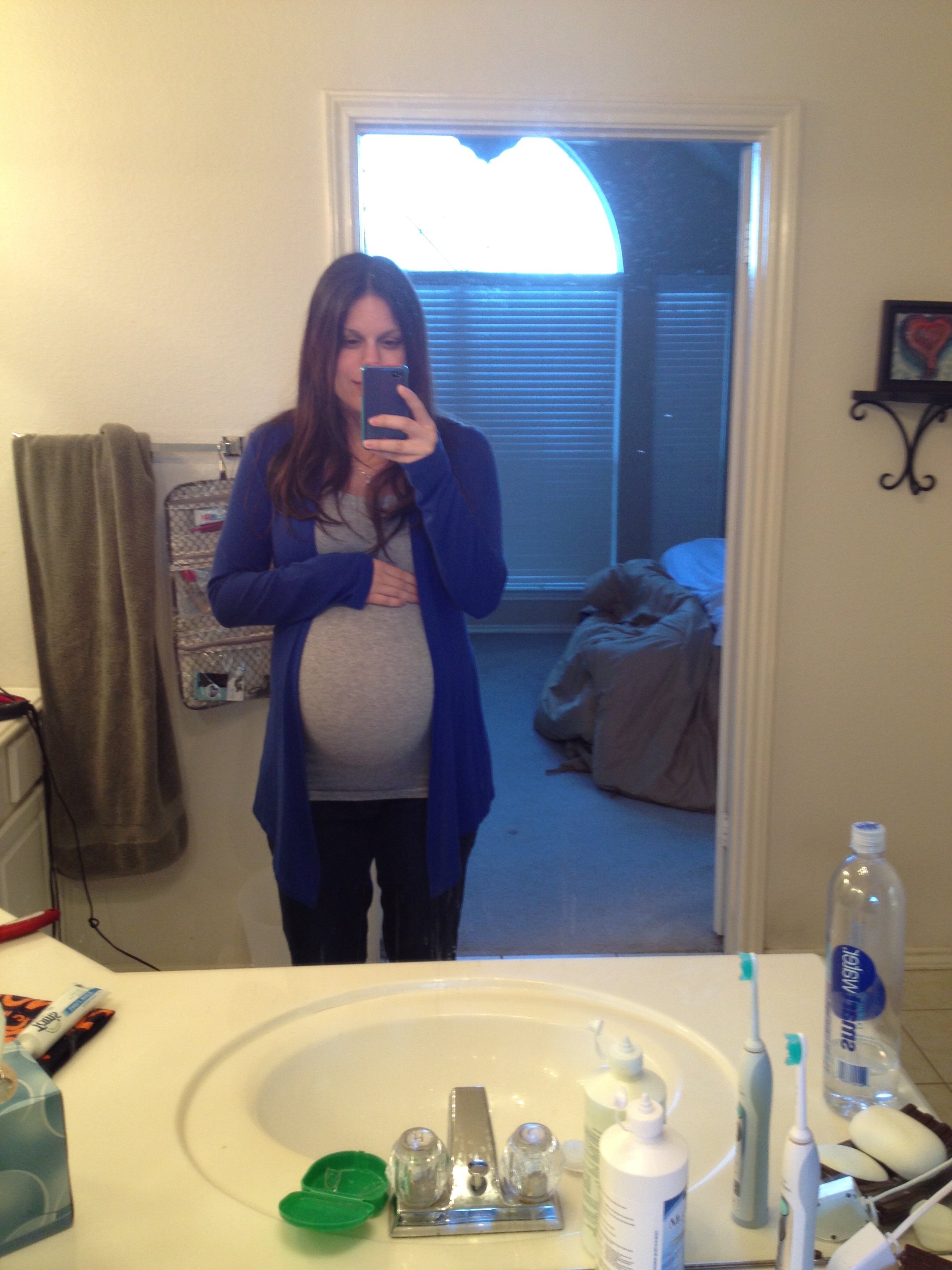 Sleep: Eh….not great. I am usually up anywhere from 3-5 times a night to go to the bathroom and I am uncomfortable. Sleeping on my sides isn’t great because my hips and back start hurting half way through the night. I was a tummy sleeper in my pre-pregnancy life and I am so ready to sleep on my tummy again. Plus in recent weeks Bella has taken to sleeping most (if not all) of the night with us in bed. She nestles in close to me (which, who am I kidding, I LOVE) but she makes me even hotter than I already am! WHEN IS FALL COMING TO TEXAS?! I know I shouldn’t complain, our high today is only 88 which considering I spent my entire second and third trimester in 100+ degree heat almost everyday this should feel like a regular cold front. Everyone is wearing cardigans and boots. Me? I am in tank tops and shorts. Ha!